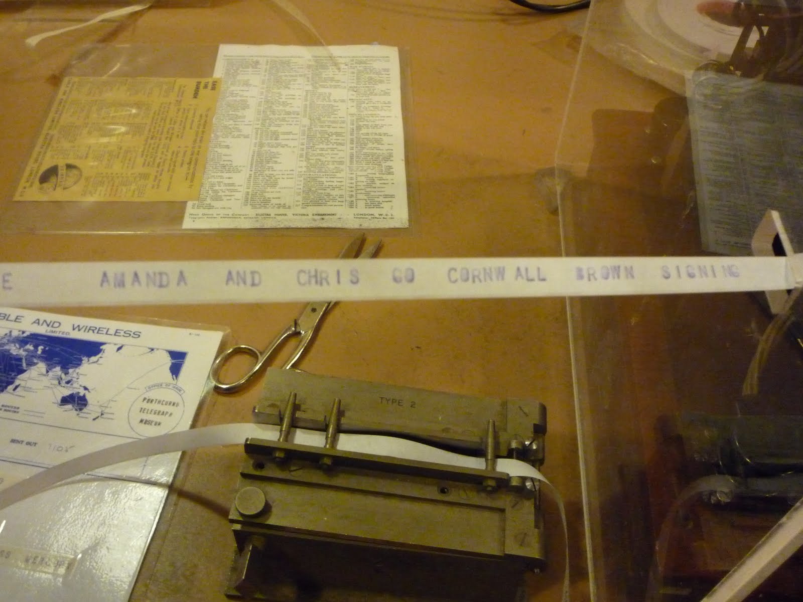 To demonstrate the telegraph process visitors get to have a go themselves (my favourite thing). At one end of the mini relay station there’s an old typewriter which you type out your message on, this then gets turned into Morse code punched out on a strip of paper, said piece of paper then gets fed into a noisy machine to be turned into an electrical signal, the message goes through another noisy machine as it gets relayed (think of it as what happened at the aforementioned far flung islands), then finally the signal gets decoded at the end and printed out on another strip of paper which you can keep for your very own, so here’s mine…